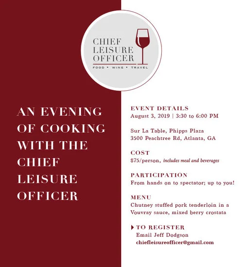 An Evening of Cooking with the Chief Leisure Officer was held at Phipps Plaza Sur La Table in Atlanta, GA. Great audience, lots of fun. The menu was a quick trip to Southern France.